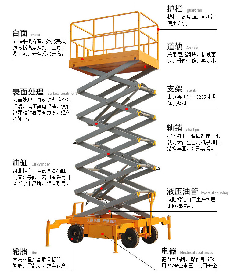 移動剪叉升降機(jī)是用途廣泛的高空作業(yè)專用設(shè)備。它的剪叉機(jī)械結(jié)構(gòu),使升降臺起升有較高的穩(wěn)定性,寬大的作業(yè)平臺和較高的承載能力,使高空作業(yè)范圍更大、并適合多人同時作業(yè)。升降動力分為220V或380V電源,柴油機(jī),或電瓶動力源,特殊環(huán)境也可采用防爆泵站及防爆電器。升高4—22米,載重0.3—3噸。采用意大利和國產(chǎn)液壓泵站,臺面使用防滑絕緣扣板,具有防滑,絕緣、安全,請放心使用。它使高空作業(yè)效率更高,安全更保障。 |